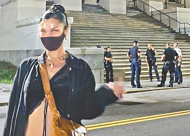 美國名模Bella Hadid有樣有身材,還相當有態度。日前她在紐約街頭,發現一班未有戴口罩的警察聚集,Bella即向他們舉起中指以示不滿。
