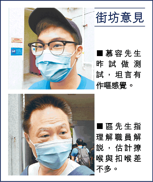 【本報訊】慈雲山慈愛苑成為首個咽喉拭子檢測試點,不少居民憂慮自行採集咽喉樣本會引起不適咳嗽或嘔吐播毒,禍及家人;亦有區議員指居民擔心基因資料外洩,甚至送中落入內地部門,暫不願接受檢測。