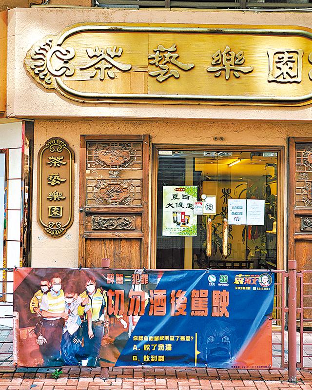 楊明上周六在港島區揸車時遇上交通意外,楊明要由兩名警員挾上白車送院,加上未能進行酒精呼氣測試,被警方以涉嫌「拒絕提供血液樣本」拘捕。楊明送院時滿身酒氣,成為「切勿酒後駕駛」的新素材。民主黨深水埗區議員袁海文昨日製作新橫額,除了有兩警挾楊明相之外,同時提醒駕駛者「醉駕=犯罪 切勿酒後駕駛」,又作出提問:「你認為他駕駛前做了甚麼? A.飲了燉湯 B.飲到劏」。