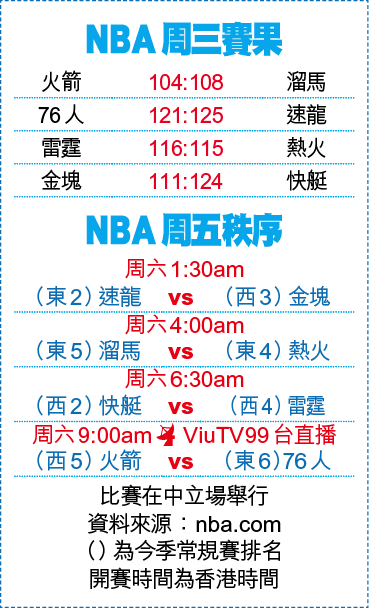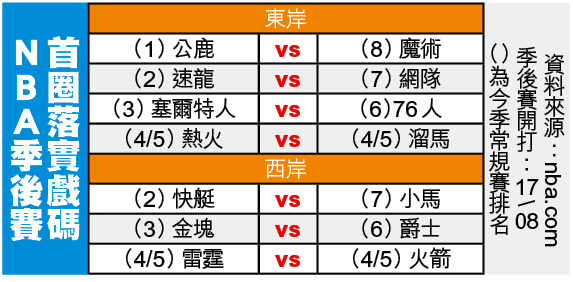經過周三的比賽,包括擊敗火箭的溜馬等多支球隊,都已確定了種籽排名,季後賽首圈戲碼亦已確定了七場(見附表)。