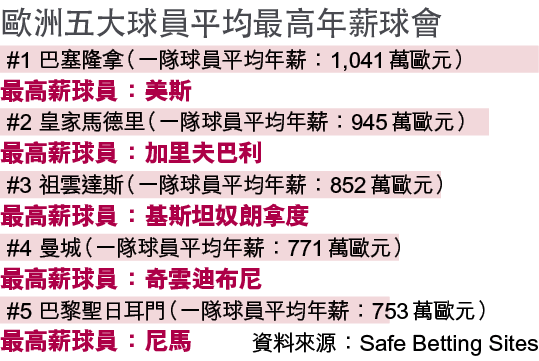 皇家馬德里少巴塞96萬歐元排第2,相信與隊內過去最高薪的基斯坦奴朗拿度(C朗)兩年前離隊有點關係,這也因此令簽下C朗的祖雲達斯攀升上第三。至於英超億萬大軍曼城排第四,球員平均年薪高過同樣由中東班主揸旗的巴黎聖日耳門(PSG);巴塞在歐聯8強的對手拜仁慕尼黑則排第6,隊內最高薪球員正是今季「弗」爆的射手羅拔利雲度夫斯基。
