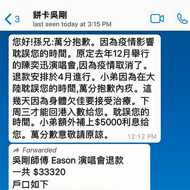 因在《歡樂滿東華》搽油食炭令人難忘的64歲吳剛師傅,近年屢傳財困,而近日有讀者孫先生向《蘋果》爆料,指吳剛拖欠他3萬多元代購陳奕迅演唱會門票的退款,一拖再拖一直未還,已報警求助,孫先生說:「佢4月時自稱病咗喺深圳留院。」而由吳剛回覆孫先生的對話中,更暗示確診武肺,有借病走數之嫌,至今失聯。