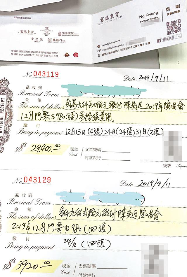 多年前已轉型做飲食生意及當上「藍店」富臨宴會部總監的吳剛,近年屢傳財困,去年他則被指2012年時被頒佈的破產令延長到去年7月,近日更有讀者孫先生向《蘋果》爆料,指吳剛拖欠他3萬多元陳奕迅演唱會門票錢未退還。孫先生指去年9月曾向吳剛訂購一批七折餅卡,以及34張「陳奕迅Fear and Dreams香港演唱會19/20」門票,門票每張980元,即合共33,320港元,全部已付錢,吳剛當時給孫先生遞上的名片,仍然任職富臨宴會部總監。