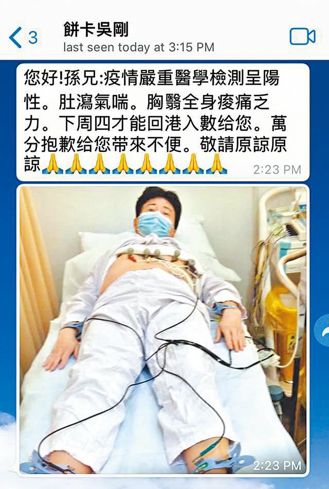 孫先生說:「舊年11月話開唔成,大會都公佈咗退款詳情,吳剛原本話12月會退番錢畀我,於是咪等佢,次次搵親佢都話再一個月,之後有個自稱吳太嘅人聯絡我話一定退,但都係一個月又拖一個月。」孫先生續說:「4月底時,吳剛有回過短訊,佢自稱病咗喺深圳留院,仲傳咗一張瞓病床相過嚟。」相中吳剛穿上白色病人服,身上駁着醫療輔助儀器,他發短訊指:「疫情嚴重,醫學檢測呈陽性,肚瀉氣喘,胸翳全身痠痛乏力,下周四才能回港入數給你,萬分抱歉給你帶來不便,敬請原諒原諒。」內容中揭露吳剛疑確診武漢肺炎。