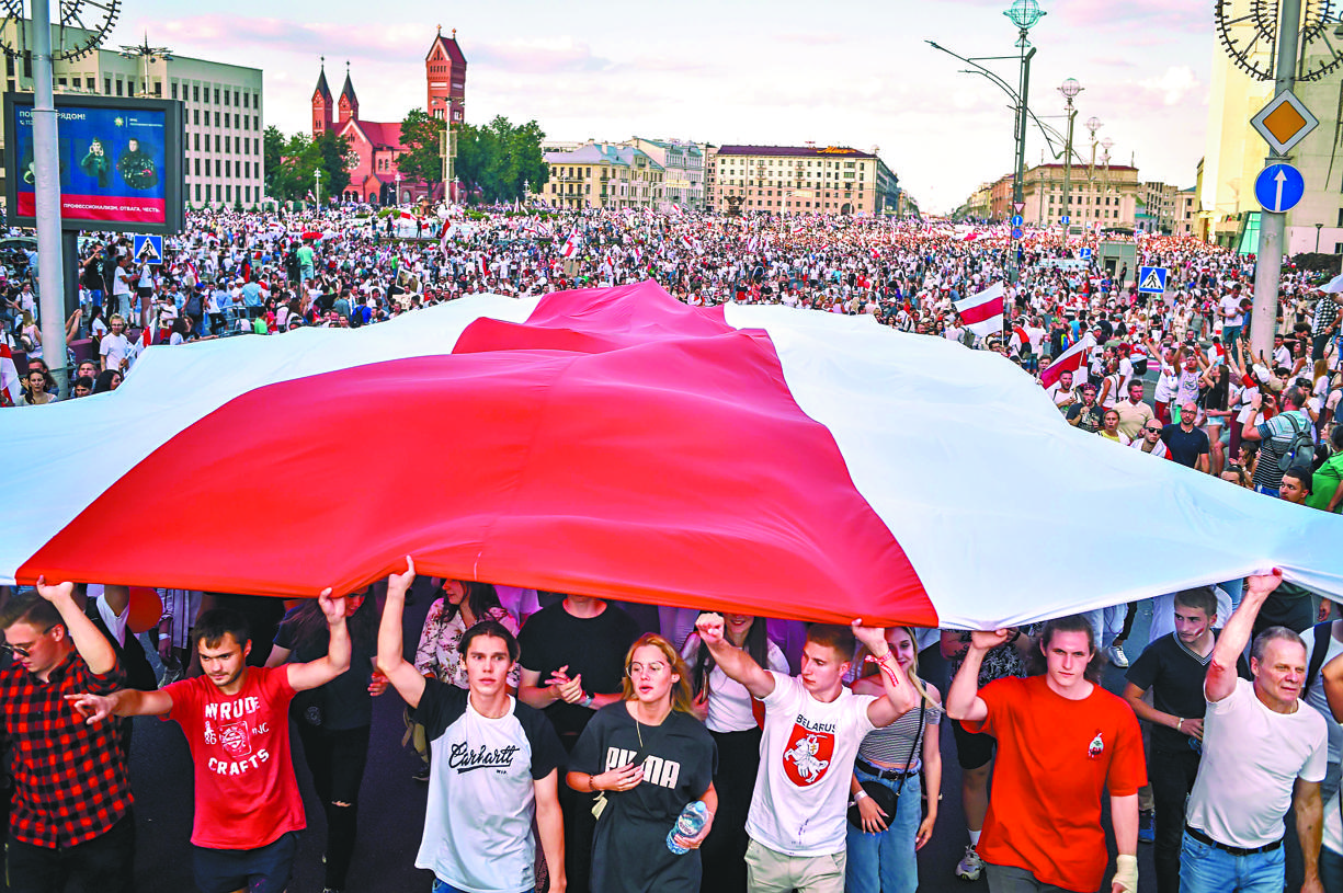 白羅斯反盧卡申科的浪潮前日推上高潮,首都明斯克和多個城市都有「自由大遊行」,估計有逾20萬人參與,為該國1991年獨立以來最多,其間沒有軍警在場。示威者除了要求盧卡申科下台,又揮動白羅斯在盧卡申科掌權前使用的紅白國旗,這面旗一直被視為反盧卡申科蘇維埃主義的象徵。