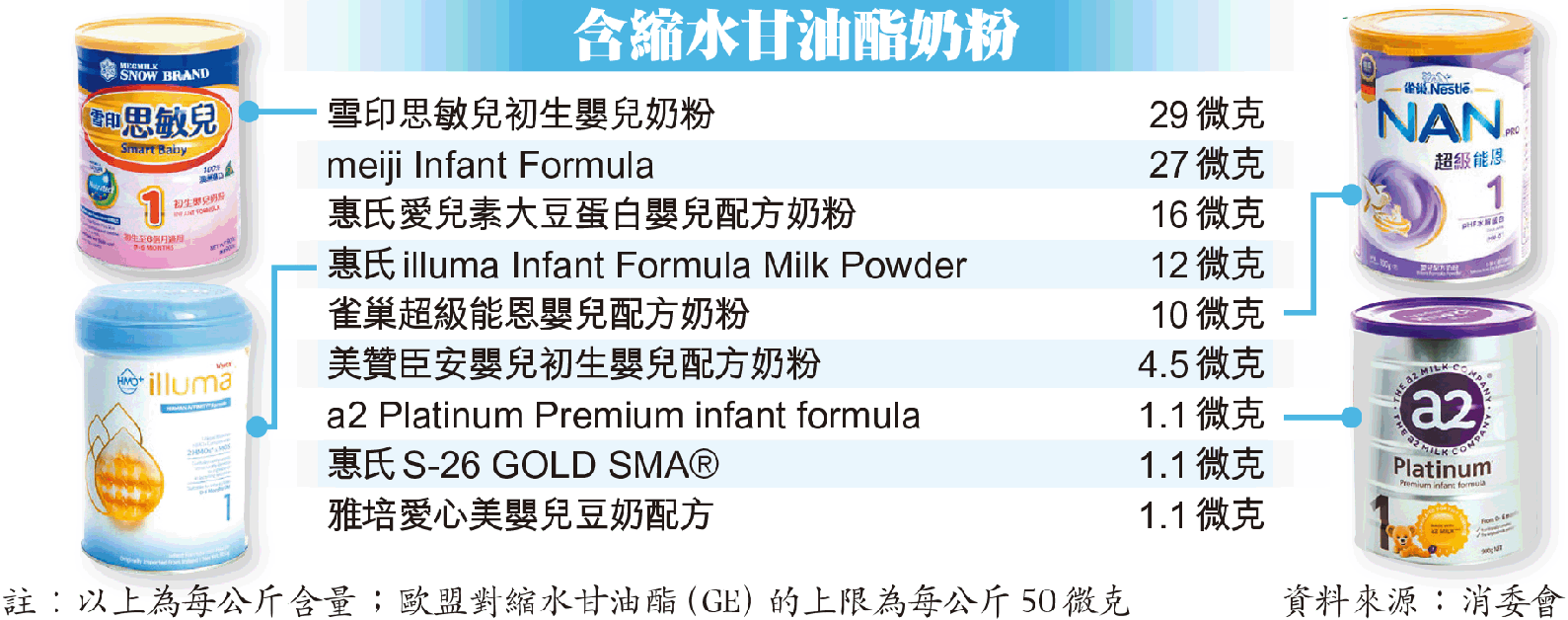 檢測又顯示,九款奶粉驗出的縮水甘油酯(GE),含量由每公斤1.1微克至29微克,含量最高為雪印一款奶粉。現時香港法例沒為嬰兒配方奶粉的含量訂定標準,歐盟訂出的GE的上限為每公斤50微克,全部15款奶粉均符合歐盟的上限規定。