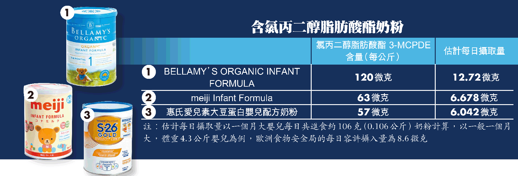 消委會測試15款嬰兒配方奶粉,發現全部含污染物氯丙二醇脂肪酸酯(3-MCPDE),含量由每公斤13微克至120微克不等。現時香港法例沒有為嬰兒配方奶粉的3-MCPDE含量訂定標準,歐洲食物安全局及糧農組織/世界衞生組織食品添加劑聯合專家委員會則分別建議每日最高可攝入量為8.6微克及17.2微克。