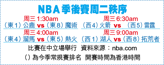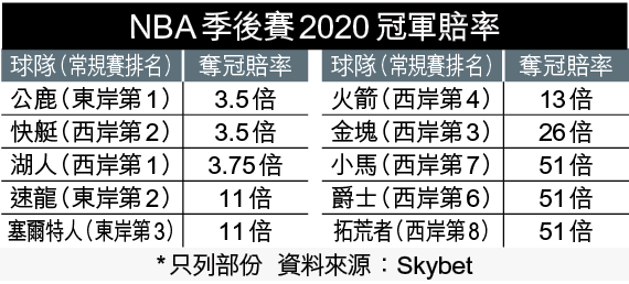 NBA常規賽季已經結束,季後賽亦正式開鑼,美國博彩公司進一步調整奪冠賠率,此前「一支獨秀」的奪冠最大熱門湖人,因復季後表現欠佳失去優勢,有外國博彩公司將紫金兵團的冠軍賠率稍為降溫至3.75倍,被快艇和聯盟一哥公鹿趕過,兩軍同以3.5倍並列為大熱門,形勢叮噹馬頭。