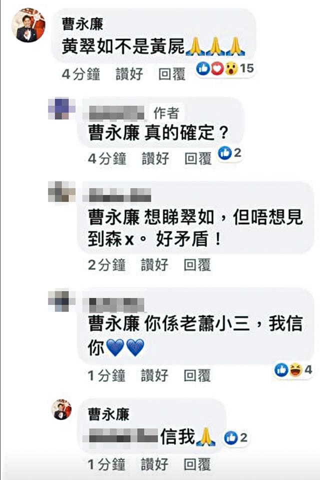 曹永廉踢爆翠如是藍絲的留言,前晚開始在網上瘋傳,網民即為翠如改姓,封她做「藍翠如」,更有不少fans在她的Ig留言表示對她非常失望,又有人留言:「藍翠如,不了」、「快啲返大灣區住啦!」也有連登仔呼籲要取消追蹤她:「除咗玩留言,記得玩埋unfollow潮,留言佢發現咗,封comment就冇得再玩,但望住跌followers可能可以笑幾日。」有人質疑Save HK群組中的「曹永廉」身份,但此「曹永廉」與林盛斌及另一藍絲莊思敏等互加好友;另有網民發現該「曹永廉」曾於5月在Save HK群組貼相撐警,故指應是其本人。對於被踢爆是藍絲,翠如至截稿前未有回覆。