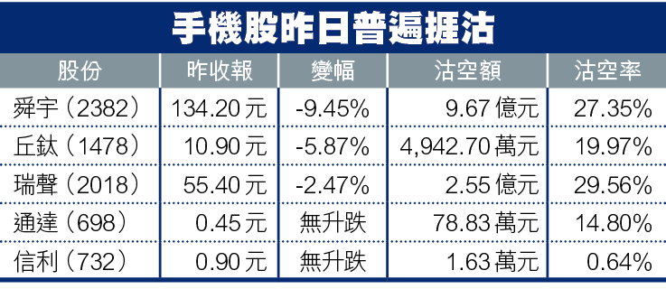 舜宇作為中美角力消息下常見的沽貨對象,昨遭投資者擲下9.67億元沽空盤,帶動整體成交額攀至35.36億元,成2018年8月14日以來交投最活躍的一天,並令沽空比率升至27.35%,為上周三以來最高水平,股價瀉9.5%至134.2元。其他被指有份向華為供貨的手機股亦走勢疲弱,瑞聲跌2.5%,沽空金額達2.55億元,丘鈦(1478)插5.9%,沽空額達4,942.7萬元。