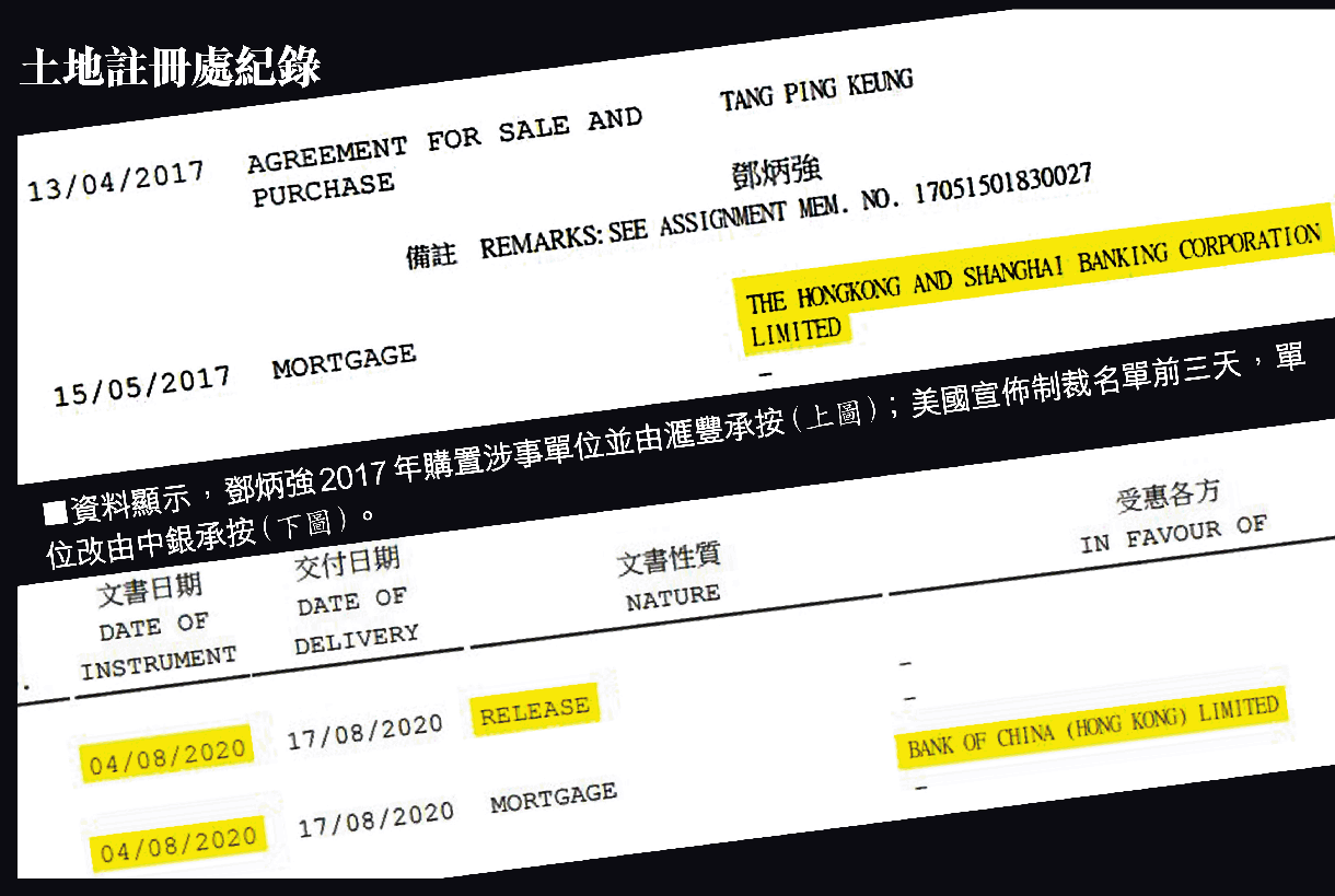 根據土地註冊處資料,警務處長鄧炳強2017年3月,以625萬元購入薄扶林置富花園富華苑十座一單位,實用面積約為439平方呎;同年5月由滙豐銀行承按。惟該按揭於本月4日還清,同日轉由中銀香港承按,即美國宣佈制裁名單前三天。而有關文件於前日(17日)方交付土地註冊處。