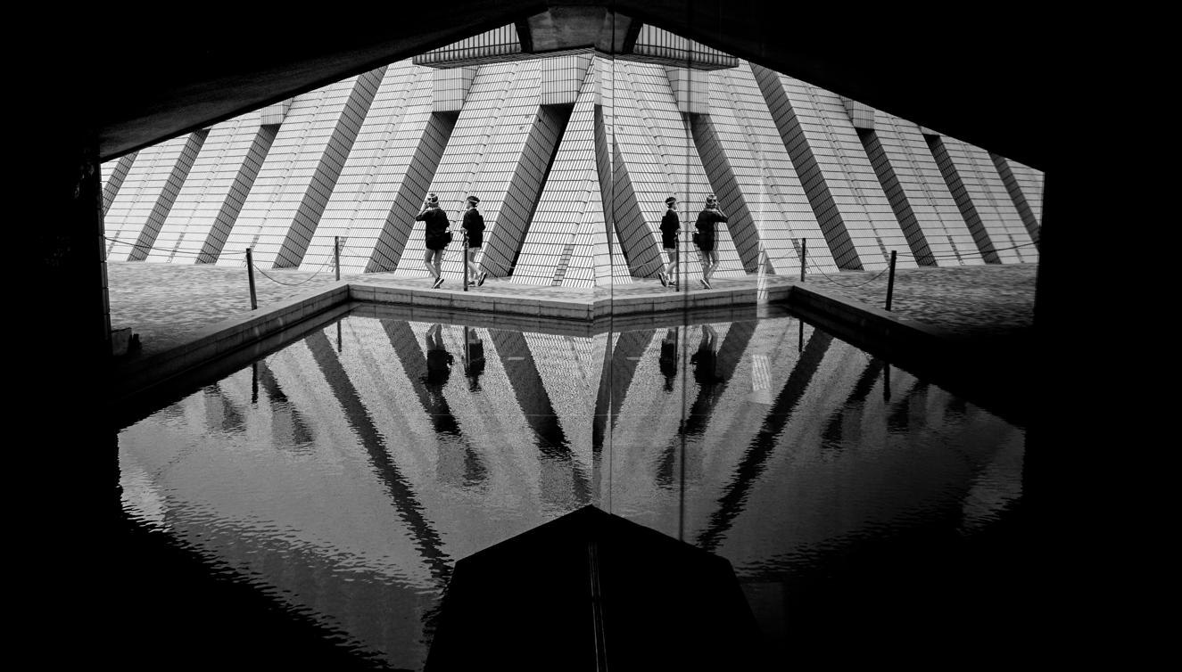 作為一名攝影創作者,他對線條、光影以及能反射影像的事物均十分敏感,借助玻璃及水池的倒影,文化中心一隅的照片隱藏着一個六角形。行人匆匆的灣仔,他同樣利用鏡面的反射,令照片產生一種節奏的美感。對Louis而言,倒影未必是玻璃或池水,汽車的反光車身,同樣可以捕捉非凡的畫面,正如那張瑪莎拉蒂車身的倒影,車身的不同位置反射着變形的怡和大廈,好比一幅抽象畫。