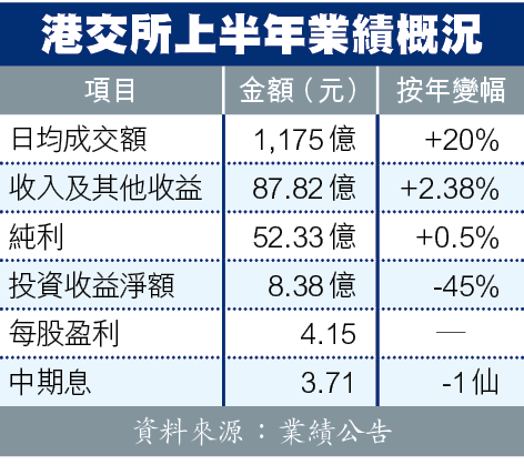 港交所上半年主要業務收入升13%至79.44億元,但今年3月全球大幅拋售資產,港交所投資收益淨額按年跌45%至8.38億元,純利只微升0.5%至52.33億元。每股盈利4.15元,中期息派3.71元。