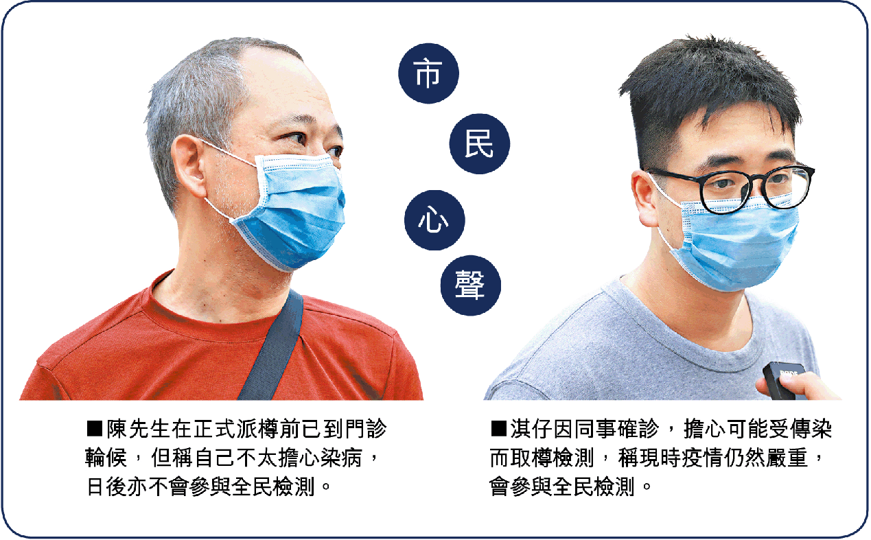 本報記者本周二早上於中九龍診所觀察診所派樽一小時,僅約30名市民索取樣本包,只及總量110份的三成多,並不踴躍。有職員透露,最近七日平均每日只派出約30份樣本包。從事銷售業的陳先生稱,居住的大廈有住戶確診,所以取樽求安心。他承認疫情緩和,不太擔心染病,他不會參與全民檢測。任職裝修的淇仔指公司有同事確診,所以取樽檢測,認為疫情仍嚴重,就算驗過一次,日後的全民檢測也會參與,以免染疫累及家人。