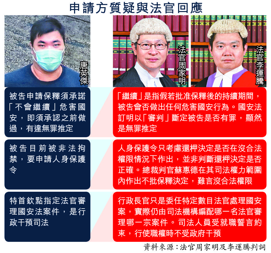 申請人唐英傑下周二(25日)會向高院申請保釋覆核,由有份處理人身保護令申請的法官李運騰審理。李官及法官周家明同時下令申請人支付律政司一方兩名資深大狀訟費。法官指申請人用錯程序挑戰總裁判官蘇惠德不批保釋的決定,指人身保護令申請只考慮還柙決定是否在沒合法權限情況下作出,蘇在其司法權力範圍內作出決定,難言沒合法權限,申請人應透過申請保釋覆核,以斷定蘇的決定是否出錯。
