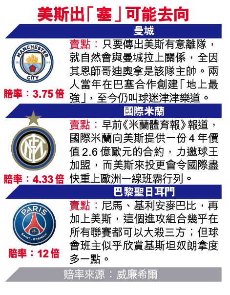 有外國博彩公司更開出美斯今夏轉會窗關閉前離開巴塞的賠率,大熱門為曼城,賠率為3.75倍,次熱為意甲的國際米蘭,賠率為4.33倍,至於前隊友、尼馬效力的巴黎聖日耳門,雖過往出手闊綽,但他們更傾向簽下美斯死敵基斯坦奴朗拿度,因此目前賠率為偏冷的12倍。