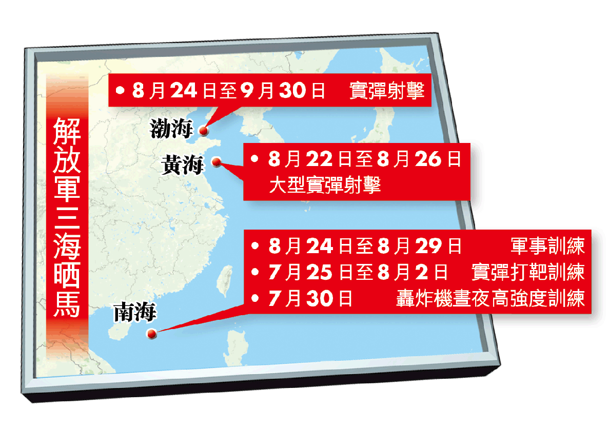 中國方面也加緊練兵,山東海事局發佈航行警告,上周六(22日)至8月26日,黃海青島至連雲港以東海域,組織大型實彈射擊演習,警告任何船隻不得進入有關海域,軍方未披露具體演習內容,山東海事局公告特別強調:「此次實彈打靶覆蓋範圍大、彈藥威力大」。與此同時,海南海事局及廣東海事局發公告,由昨日至29日,解放軍在海南島東南部海域及粵東海域進行軍演,先前南部戰區也曾於7月底派遣轟炸機,在南海晝夜進行高強度飛行訓練。唐山海事局也公告,昨日至9月30日在天津和秦皇島間渤海海域執行實彈射擊演習,範圍約為半徑25公里的扇形區域,演習長達37天,也是所有演習中時間為期最長。換言之,由昨日開始大陸沿海海岸幾乎每日都有軍演,戰區橫跨大陸北中南戰區,情況過去不多見。