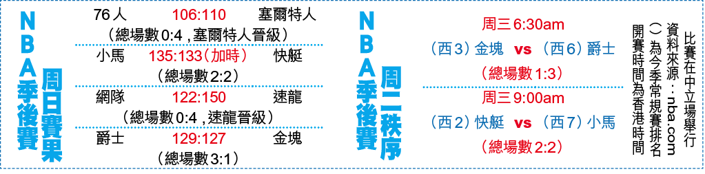 不過第3節小馬在當錫帶領下豪取35分,他個人亦單節攻入13分,成功後上反超。可是,一度領先超過12分的小馬又犯下未能保住勝局的老毛病,最終快艇靠尾段的路威廉士(Lou Williams)接連取分,趕及扳平比分令比賽要以加時分勝負。