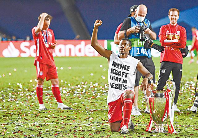 【感恩有祢】■為拜仁鎮守中路嘅阿拉巴(前),着住印有「耶穌給我力量」的tee感謝主。美聯社