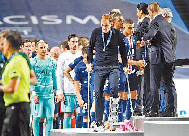 【繼續努力】■腳傷仲未好嘅PSG主帥杜曹(黑衫),攞牌嗰陣都仲要用拐杖,希望佢早日康復。路透社