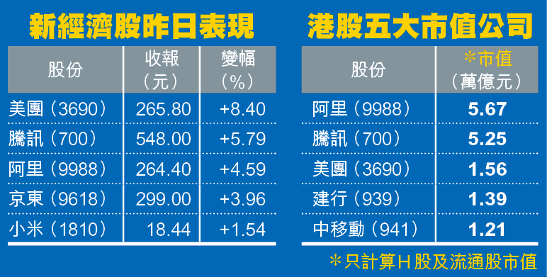 【本報訊】本港科技股昨日利好消息橫飛,「ATM」單日合計有近375億元資金煲起,股價升勢凌人。當中,獲大行鬥升目標價兼得北水力撐的美團(3690),曾最多飆逾一成,破頂高見272元。美團市值更在短短兩個月,由一萬億元衝高五成至逾1.5萬億元,晉身第三大市值港股,僅次阿里(9988)及騰訊(700)。三隻股份單日市值則累增逾6,500億元。
