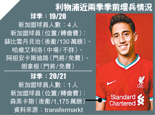 將爭取衞冕英超的利物浦,近1、2季在轉會市場沒有多大動作,今季季前暫時只收購了希臘左後衞森美卡斯。不過領隊高普並不擔心,指縱使預計20/21球季英超競爭將非常激烈,但紅軍增援是重質不重量,加上離英超轉會窗關閉仍有一段時間,不排除仍會有大牌球星加盟。