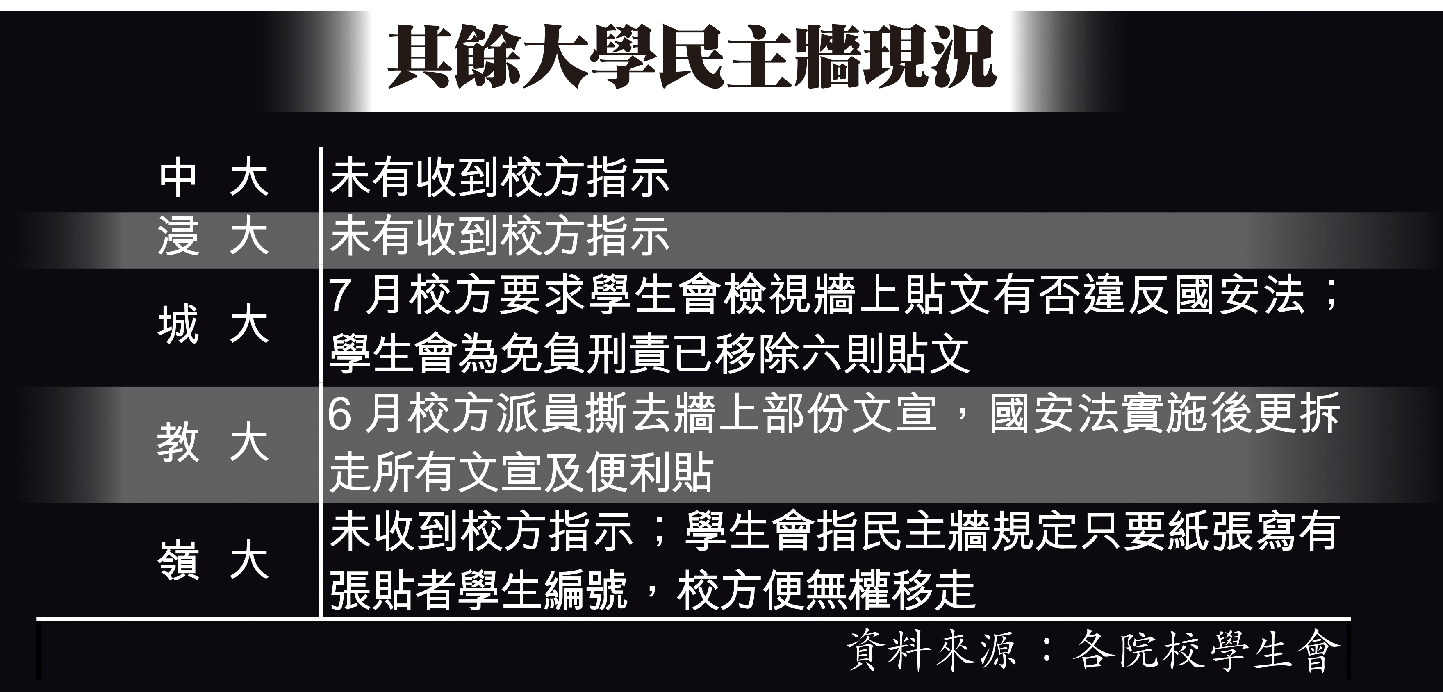 至於曾因民主牆風波而踢學生出校的理大,繼續干預由學生會管理的民主牆,包括以黑紙遮蓋民主牆上涉及港獨或其他敏感字眼;牆上只剩空白便條無聲抗議。理大學生會署理會長陳嘉禧表示,從不對大學高層捍衞言論自由抱期望,「好老實講,遲啲佢繼續詮釋國安法落去,我哋(學生會)嘅存在都違反國安法㗎喇。」