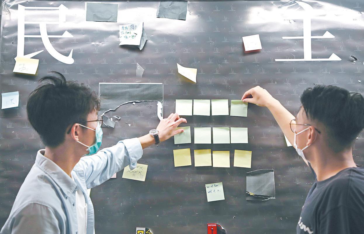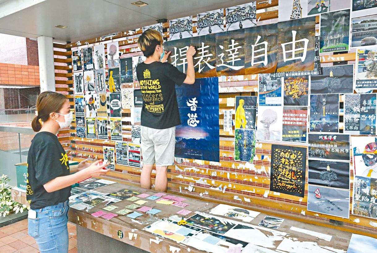 【本報訊】國安法下紅線處處,代表言論自由的大學民主牆及連儂牆被校方「消毒」。香港大學被指撕走連儂牆的港獨文宣,學生會引述校方稱不希望「港獨」或「驅逐共黨」等標語再現牆上;科技大學更禁止同學在學生會告示板張貼無字便條。有大學學生會幹事坦言,大學乃至香港「已無任何自由表達嘅空間,就算唔講嘢都會犯法。」