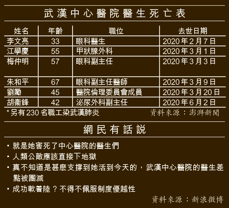武漢市中心醫院是全國最多醫生死亡及感染武漢肺炎的醫院,一共造成六名醫生死亡,包括李文亮醫生及胡衞鋒醫生,另亦有超過230名院內職工感染。有醫生家屬稱胡衞鋒去世時,很多醫護想用自己的方式悼念,但被蔡莉嚴厲禁止在朋友圈發聲。