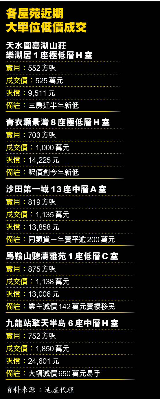 近期大單位表現不濟, 頻現劈價及蝕讓。天水圍嘉湖山莊大單位連環跌穿600萬元,市場消息指,樂湖居1座極低層H室,實用552方呎,三房兩廁間隔,業主上月尾原以540萬元放售,已經是嘉湖全場最平三房放盤,日前減多15萬元,即以525萬元獲承接,呎價9,511元,創屋苑三房近半年新低。中原網頁顯示,同座呎數一樣的中層H室,今年3月以580萬元賣出,即相隔約五個月,賣平55萬元。