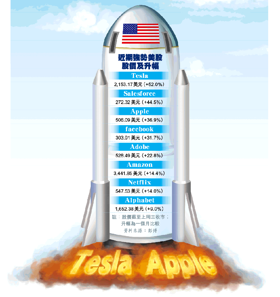 破頂後新一輪升浪,源自蘋果及Tesla先後公佈股份分拆,公佈至今兩者股價分別升32%及52%;蘋果公佈第三季純利按年升18%,iPhone、iPad、服務等各分項業務皆按年增長,分拆及業績同時推動股價。Tesla截至7月底盈利達1.04億美元,符合加入標指條件,亦令市場繼續炒憧憬。