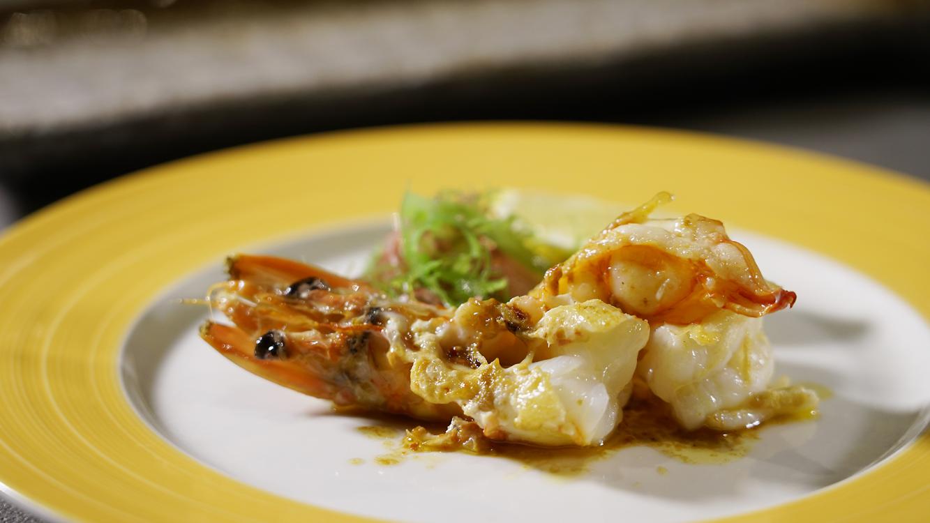在鏗鏘作響鐵板前,廚刀廚叉一橫一直,便將虎蝦頭順勢去掉,硬橋硬馬。