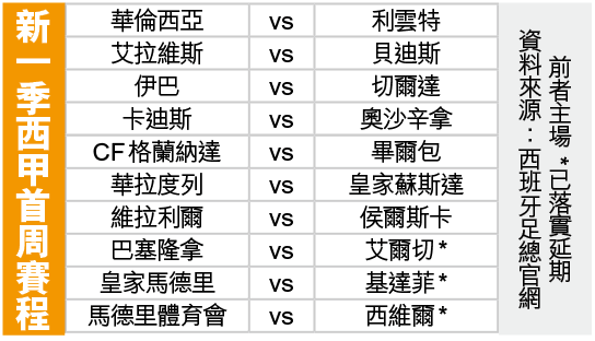 【綜合西班牙外電】西甲球會皇家蘇斯達周一宣佈,剛由英超曼城加盟的西班牙中場大衛施華,確診武漢肺炎。此外,西甲周一公佈新一季賽程,賽季將於9月13日揭幕,為了讓上月有份參戰歐洲賽的各支球隊,有更多時間休息及備戰,開鑼日只會上演七場賽事,而皇家馬德里主場迎戰基達菲、艾爾切作客鬥巴塞隆拿,以及馬德里體育會在主場惡硬西維爾,都會押後上演。最矚目的「國家打吡」將會在第7及第30周上演,10月25日的首循環大戰會先由巴塞主場。