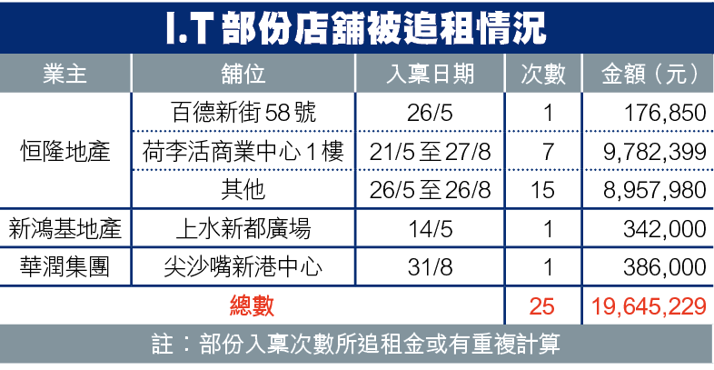 另一集團亦開始追討I.T租金。華潤集團持有的新港中心,8月31日以CRE Property(Silvercord)入稟追討38.6萬元。目前,I.T集團於新港中心共租23個舖位。此外,新地(016)旗下上水新都廣場,5月中旬入稟向I.T追租34.2萬元;據香港01引述新都廣場管理公司指,5月份已撤回相關入稟狀。