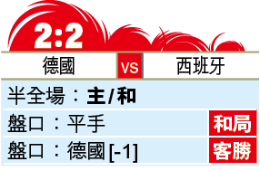 雖然2軍近4次交手總入球數都在2球或以下,但最近交手已在2018年3月。再者,西班牙在近8場賽事6度開「大」;德國近3場賽事更成功轟入對手3球或以上,今場上演入球「騷」機會不小。