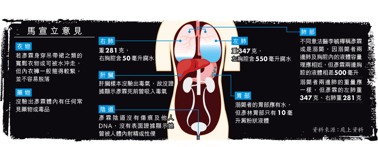 惟馬不同意報告稱彥霖或是溺斃的說法。他解釋,溺斃者死後,水會先積聚在肺部,肺部腐爛後,水會逐漸流入胸腔,故胸腔亦會有積水。溺斃者的肺部一般會吸入近千克液體,兩邊肺的重量應一樣,但彥霖的左肺重347克、右肺重281克。另外,溺斃者兩邊肺及胸腔內的液體容量理應相近,惟彥霖左胸腔內有550毫升腐爛液體,右胸腔卻只有50毫升腐液,兩者相差500毫升。但正常情況下,理應兩邊胸腔及肺內液體差不多,「當你吸入水,水應該係兩邊走的,唔會吸入一邊、唔吸入另一邊」。溺斃者的胃部應有水,但彥霖的胃部僅有10毫升澱粉狀液體。