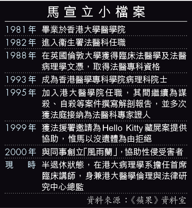 獲死因庭邀請以專家證人身份出庭的馬宣立供稱,他今年5月撰寫一份專家報告,並引述法醫李毓樺所撰寫的驗屍報告。他指出,沒在彥霖陰道找到他人的DNA以及傷痕,故沒有表面證據顯示曾有人在她體內射精,或她曾受性侵,惟屍體已在水中浸泡一段時間,不知有關證據是否已被水沖走。馬同意驗屍報告所指,由於彥霖屍體已腐化,屍體沒發現任何傷痕,亦沒驗出體內有任何常見藥物或毒品,因此無法確認死因。