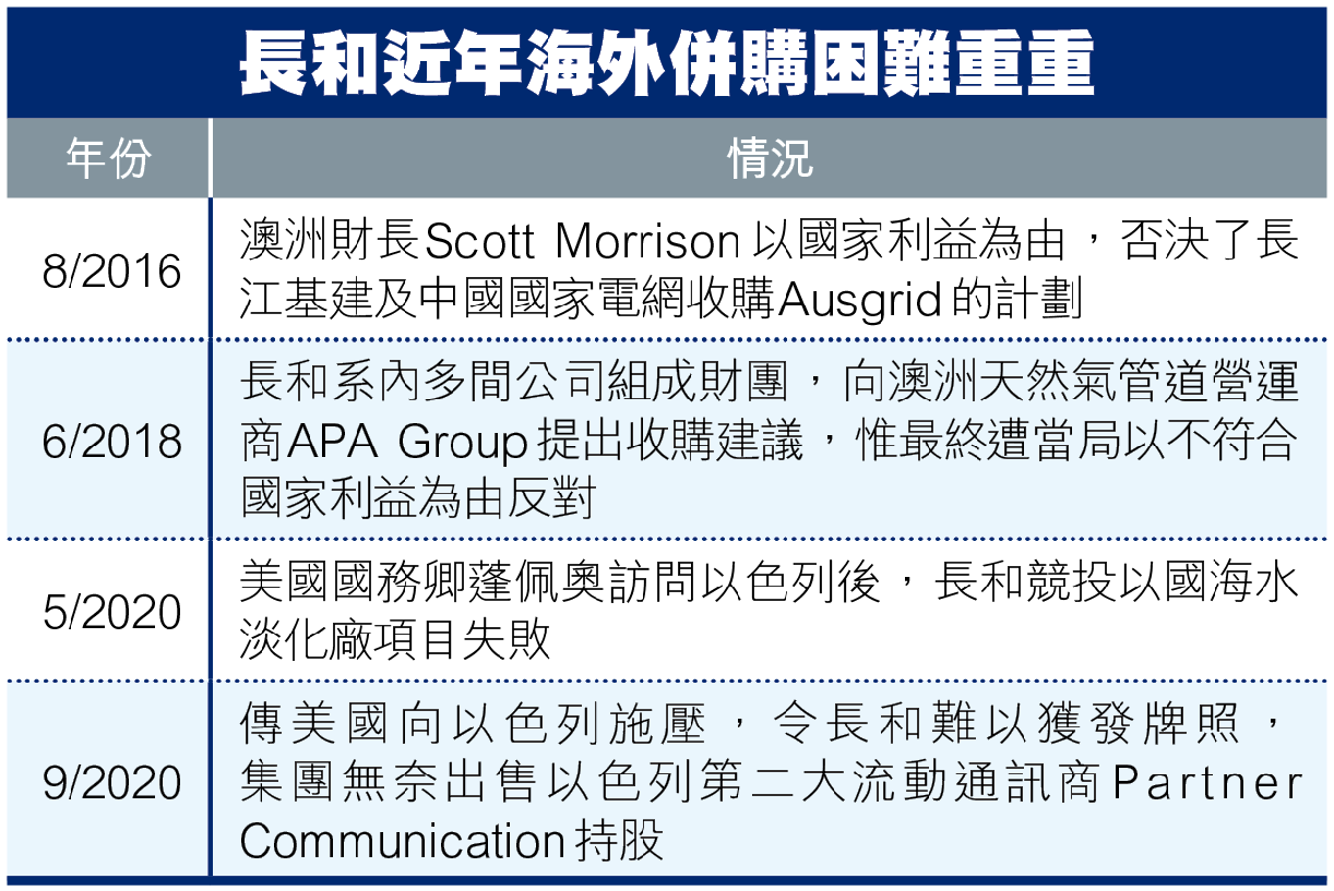 回顧長和系外闖戰績,集團對公用事業情有獨鍾,但近年的海外拓展計劃似乎未如理想,先後於2016年及2018年遭到澳洲當局以國家利益為由反對其併購電網公司Ausgrid及天然氣管道營運商APA Group;今年5月,受中美關係惡化波及,長和競投以色列的海水淡化廠項目最終也失敗,當時有傳美國國務卿蓬佩奧閃電訪問以色列時,曾敦促以國在經濟戰略領域限制中國投資。