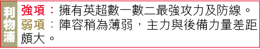 高普用人貴精不貴多,上季使用球員數目是Big6中最少,但後備實力並非太強,前線如「埃及文明」欠缺其一的情況下威力便大大下降;亦如中堅華基爾雲迪積克與門將艾利臣比加亦不可缺乏。一兩名主力受傷,對紅軍來說都是致命傷。