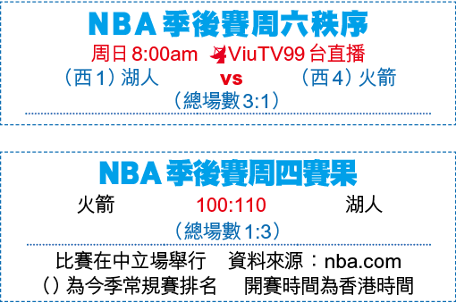 湖人周四於季後賽西岸次圈第四回合迎戰火箭,「紫金軍團」今戰憑身高優勢狂闖禁區,整隊於火箭顏色地帶轟下62:24比分,安東尼戴維斯(Anthony Davis、AD)拿下29分和12籃板,獲「準三雙」的勒邦占士(LeBron James)更狂摘15個籃板,助湖人110:100擊敗火箭,場數領先至3:1叫糊。只要於香港時間周日第五戰再下一城,便可躋身西岸決賽。(ViuTV99台明日8:00am直播)
