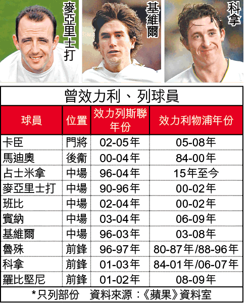 原來除了米拿外,效力過列斯聯及利物浦兩家球會的英超球星,可以組成一支具有實力的球隊出賽,其中門將有前英格蘭國腳卡臣,防線上有蘇格蘭名將馬迪奧,中場線有還有麥亞里士打、班比、賓納、基維爾等人,前線的名字更加響噹噹,包括有一代名將魯殊、前英軍射手科拿及前愛爾蘭隊長羅比堅尼,都是曾效力過兩間球會的英超球星。