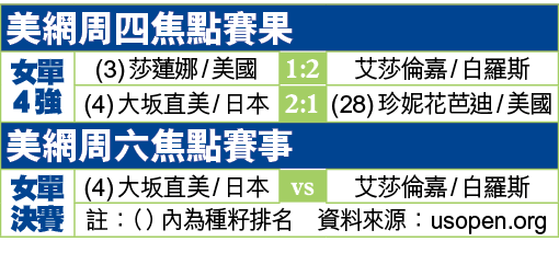 【綜合美國外電】莎蓮娜於周四美國網球公開賽的「媽媽大戰」準決賽中,不敵白羅斯的艾莎倫嘉出局,不但挑戰個人24項大滿貫女單冠軍失敗告終,也無緣與同日較早前晉級的大坂直美上演兩年前不敵對方的翻版決賽。大坂直美在周六與艾莎倫嘉對決,爭取第二次在這項賽事封后。(now670及有線651台明日3:30am起直播)