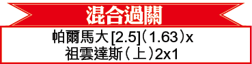 同日早場,拿玻里作客帕爾馬,前者季前花5,000萬歐元轉會費從法甲里爾簽下21歲前鋒域陀奧森漢,希望加強球隊攻力。這位尼日利亞前鋒亦不負所託,首次為球隊上陣就在熱身賽上演帽子戲法,加上球隊仍有梅頓斯、恩斯治尼等進攻好手,入球必多;另外,翻看帕爾馬上季聯賽的主場成績,復賽後6場聯賽僅贏得1場外,六場賽事均開「大」,總比數達三球或以上,今仗可敲[2.5]的入球「大」。(球賽編號:星期日13; now638、有線654及無綫myTV Super301台今日6:30pm直播)