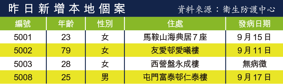另一源頭不明個案為第5001號23歲印傭,在馬鞍山雅典居7座與僱主同住,9月15日病發,到私家醫院求診而確診。她曾在9月14日放假時與兩名外傭朋友到旺角、深水埗及尖沙嘴,曾在深水埗印度食肆及尖沙嘴食肆用膳,但記不起詳細地址。她僱主一家「有老有嫩」及兩名外傭朋友均需送入檢疫中心,兩外傭若檢測後呈陽性,她們的僱主亦要檢疫。
