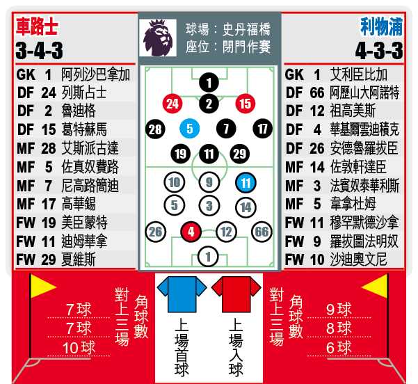 兩隊進攻能力皆相當出色,紅軍射手穆罕默德沙拿上仗大演帽子戲法,羅拔圖法明奴與沙迪奧文尼在前場亦隨時能製造威脅,今造訪史丹福橋球場預計入球必多,加上後防線各有隱憂,大手交易可期。