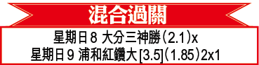 日職榜首川崎前鋒今日作客浦和紅鑽,兩軍近期不缺入球,今場勢必合演一場入球騷,「入球大細」中位數[3.5球]可照撐「大」。(球賽編號:星期日9;有線661台今日6:00pm直播)
