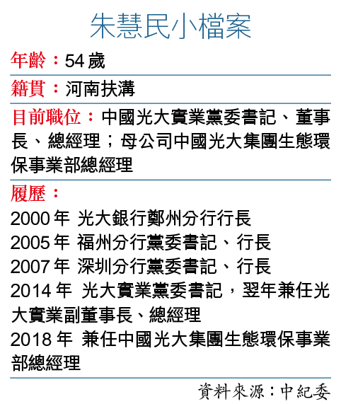 中紀委昨公佈中國光大實業黨委書記、董事長兼總經理朱慧民涉嫌嚴重違紀違法,日前已被帶走調查。朱曾於光大銀行深圳分行擔任一把手七年之久,內媒引述消息指,朱被查主因涉任職光大銀行期間的問題,他當年的副手也被帶走調查。當局今次更罕有地借調黑龍江監察委員會協助調查,案件牽涉規模非比尋常。