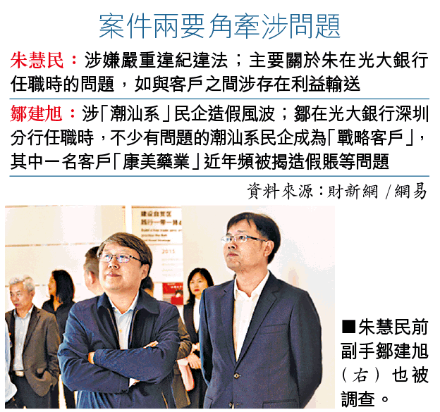 至於另一涉案人鄒建旭,《財新》指他在深圳耕耘多年,一直很有「門路」。鄒任職光大銀行深圳分行時,與宜華集團、康美藥業等潮汕系民企關係密切。本報翻查資料,發現康美藥業2013年成為光大銀行總行戰略客戶,時任光大銀行深圳分行行長朱慧民,也專程到康美藥業深圳總部授牌。