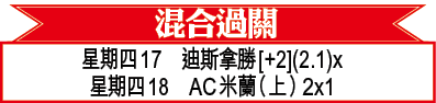 周四歐霸盃外圍賽意甲的AC米蘭主場迎戰挪超球隊波杜基林特,米蘭開季兩戰同樣輕鬆贏波,老將伊巴謙莫域更是狀態大勇,連續兩場有「士哥」。雖然對手波杜基林特半季不敗,不過實力上料與米蘭仍有一段距離,故米蘭讓球半/兩球照捧上盤。