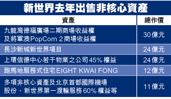 鄭志剛指集團採取「現金為王」的策略,去年已出售約106億元非核心資產,據資料當中包括上環信德中心內部份物業、德福廣場二期商場及PopCorn 2商場等。今年新世界會加碼出售130至150億元非核心資產。鄭志剛於今年2月提及,有意出售只持少數股份或未管握控制權的項目。他補充,「集團可動用資金達千億,期望於疫市中能趁低吸納,部署更有價值的投資。」